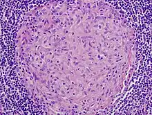 - (pathology) an inflammatory nodule consisting of histiocytes (macrophages) attempting to wall off substances they perceive as foreign but are unable to eliminate, such as certain infectious organisms as well as other materials such as foreign objects, keratin and suture fragments.