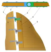 A rudder system of a boat making use of pintles (blue, number 2) and gudgeons (etymology 2, sense 1.1; green, number 3).