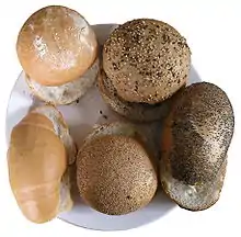 Five different kinds of sweet roll. The håndværker is the poppyseed-covered one on the right.
