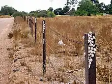 Malwod Theba pisana yn hafgysgu ar byst ffens yn Awstralia