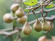 - pear (edible fruit similar to an apple but elongated towards the stem)