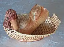 1. breadbasket, bread basket (a basket used for storing or carrying bread)