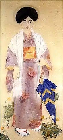 - A traditional Japanese T-shaped, wrapped-front garment with square sleeves and a rectangular body, now generally worn only on formal occasions.