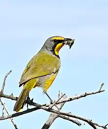 - A southern African bird Telophorus zeylonus: a bokmakierie, a predominantly yellow and green shrike with a loud, musical, antiphonal song. A narrow black stripe extends from the eye and the base of the beak as a collar across the throat; the breast is a brilliant yellow. The back is a slightly olive green, the head grey.