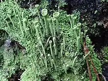 From kopje (“little cup”) + -s- + bekermos (“any of various lichens of genus Cladonia”).