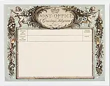 - decorative telegram form (preprinted card base on which the text of a decorative telegram is written or printed)