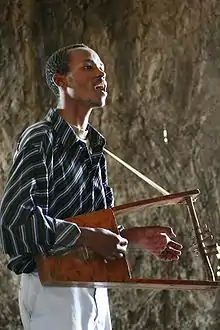 an Ethiopian man playing a krar