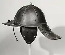 - A European combat helmet, worn especially from the 1600s into the 1700s, consisting of a rounded skull-piece, often cheek guards and a nasal or face-guard, and a laminated defence (or single plate ridged to imitate lames) to protect the back of the neck that resembled a lobster's tail.
