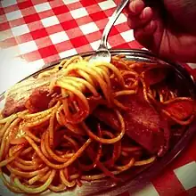 - A Japanese dish styled on Neapolitan food; spaghetti topped with ketchup or tomato sauce, onion, button mushrooms, green peppers, bacon and Tabasco sauce.