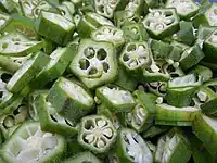 - The flowering mallow plant Abelmoschus esculentus itself, now commonly grown in the tropics and warmer parts of the temperate zones.