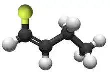 This represents an organofluorine compound, 1-fluoro-1-butene, in which just one bond on a carbon backbone is occupied by fluorine.
