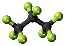 This ball-and-stick model of octafluoropropane represents an organofluorine molecule in which every free bond on a carbon backbone (shown as black) is occupied by a fluorine atom (shown as green).