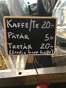 Coffee/tea cost 20 SEK. First refill cost 5 SEK and second refill cost 20 SEK. Notice that the sign clarify the word tretår (“second refill”).