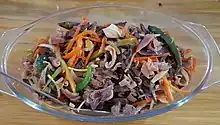 - a Filipino dish made from various pork, goat, or beef tripe or offal (internal organs), with sautéed spices, such as julienned ginger, chilis (siling mahaba), bamboo shoots (labong), carrots, bell pepper, tomatoes, garlic, onions, and black pepper, among other ingredients, especially in the cuisine of Central Visayas and Mindanao