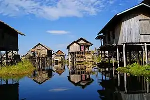 - lake dwelling, stilt house (a house raised on stilts over the surface of the soil or a body of water)