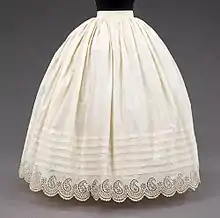 - (archaic or historical) A type of ornamental skirt or underskirt, often displayed below a dress; chiefly in plural, designating a woman's skirts collectively.