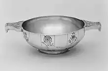 - (Scotland, historical) A traditional shallow, two-handled cup of Scottish origin symbolizing friendship. It was originally used to toast the arrival or departure of a visitor.