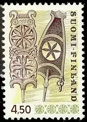1. (paddle-shaped) distaff (part of a spinning wheel from which fibre is drawn to be spun)