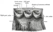 Three semilunar shaped leaflets of the aortic valve in the heart.