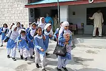 Schoolgirls in Pakistan, in shalwars with cuffed hems, and kameez with collars.
