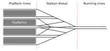 - (rail transport) the often constricted area at the end of a railway station where running lines divide into platform tracks.