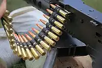 - (firearms) ammunition belt (firearm device used to package and feed cartridges, typically for rapid-firing automatic weapons such as machine guns)
