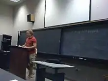 Professor w:Casey Clabough lecturing from a modern academic lectern.