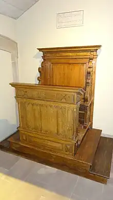 A raised pulpit-style desk at the w:Jean Sturm Gymnasium.