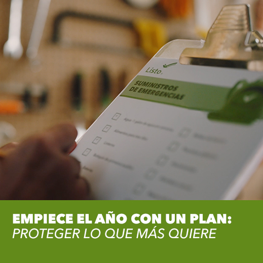 Un grupo de amigos construye un kit de suministros de emergencia. El texto dice Año nuevo, nuevas metas: Decídase a proteger su legado.