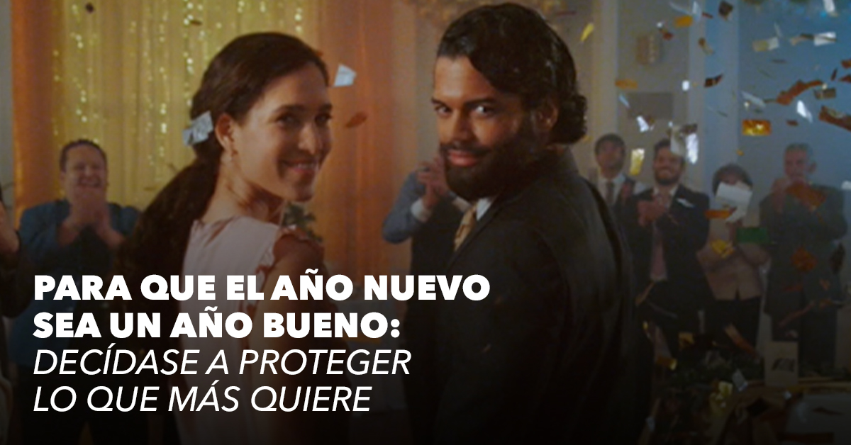 Una pareja mirando por encima del hombro en una fiesta de año nuevo. Nuevo año, nueva resolución: decida proteger lo que usted más quiere.