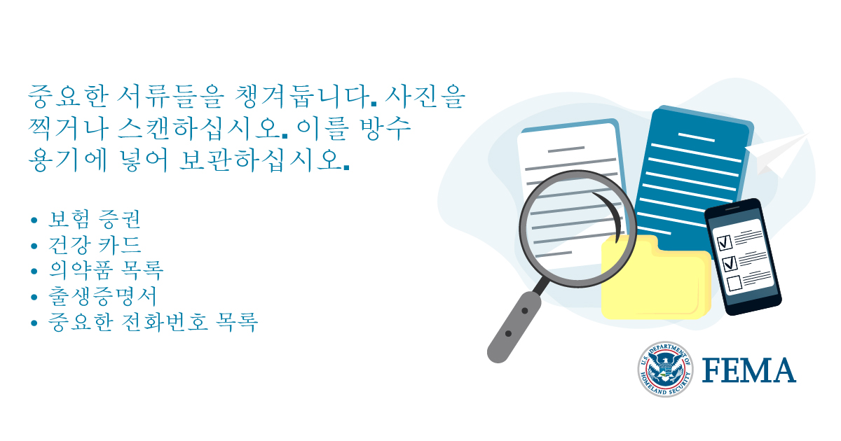 중요한 문서를 모아두세요. 사진을 찍거나 스캔하세요. 방수 보관함에 넣어두세요. 여기에는 보험증서, 의료 카드, 약품 목록, 출생증명서, 중요한 연락처 목록 등을 포함하도록 하세요.